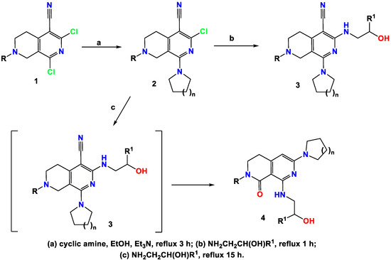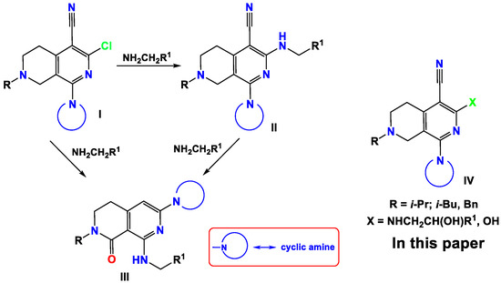 Here, we determined how the group on the piperidine ring of the 2,7-naphthyridine system can affect the rearrangement, examining the behavior of 7-isopropyl/isobutyl-5,6,7,8-tetrahydro-2,7-naphthyridines IV (R = i-Pr, i-Bu; X = NHCH2CH(OH)R1, Figure 1). During these studies, azepane was also used for the first time as a cyclic amine.