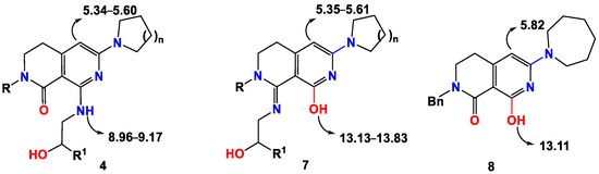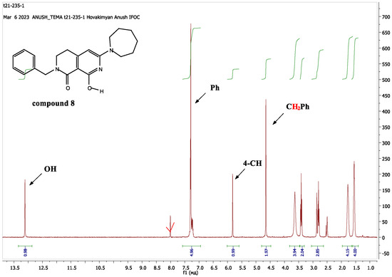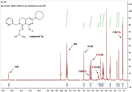 In the 1H NMR spectra of compounds 7a–g, the presence of the reacting amine fragment was demonstrated by the detection of protons from the NCH2CH(OH)R1 group of the singlet signal of the proton of the 4-CH group at 5.35–5.61 ppm and of the broad proton signal of the OH group at 13.13–13.83 ppm. From the spectrum of compound 8, it is clear that the singlet signal of the CH group of the pyridine ring appears at 5.82 ppm and the singlet signal of the OH group appears at 13.11 ppm, which is typical of the rearranged compounds. For clarity, Figure 2 and Figure 3 show the 1H NMR spectra of compounds 7g and 8.