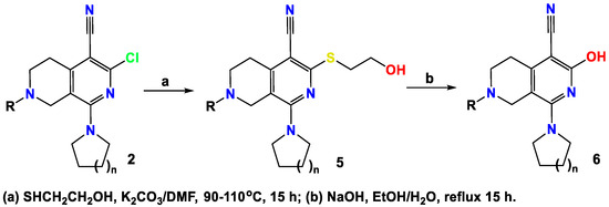 It is very interesting to investigate the proposed rearrangement in 1-amino-3-oxo-2,3,5,6,7,8-hexahydro-2,7-naphthyridine-4-carbonitriles 6a–f. Compounds 6a,c were recently synthesized by us via a Smiles rearrangement [23,24,25] as synthons for the preparation of novel heterocyclic systems: furo [2,3-c]-2,7-naphthyridines [23]. 1-Amino-3-chloro-2,7-naphthyridines 2a–f reacted with 2-mercaptoethanol to give the corresponding 1-amino-3-[(2-hydroxyethyl)thio]-5,6,7,8-tetrahydro-2,7-naphthyridine- 4-carbonitriles 5a–f [23]. Compounds 5 undergo a Smiles rearrangement [23,24,25] resulting in 1-amino-3-oxo-2,7-naphthyridines 6a–f, in high yields (Scheme 2). The structures of the obtained compounds 6 were confirmed by spectroscopic and by elemental analyses.