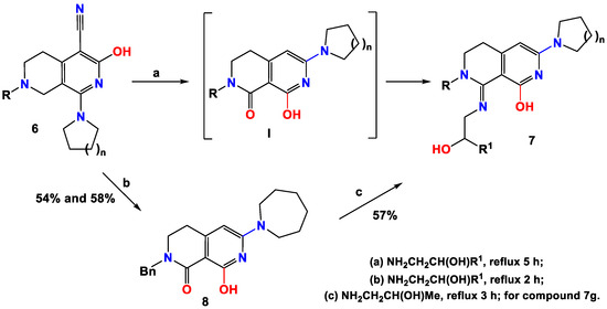 Only in one case did we succeed in isolating and identifying the rearrangement intermediate product I (compound 8). Thus, the reaction time was reduced to 2 h and during the reaction of compound 6f with 2-aminoethanol or 1-aminopropan-2-ol the 6-azepan-1-yl-2-benzyl-8-hydroxy-3,4-dihydro-2,7-naphthyridin-1(2H)-one, (8) was isolated in 54% and 58% yields (Scheme 3, Table 2). When compound 8 is refluxed with 1-aminopropan-2-ol for 3 h, as expected, compound 7g was formed in a 57% yield, which once again proves that the reaction proceeds through intermediate I (Scheme 3).