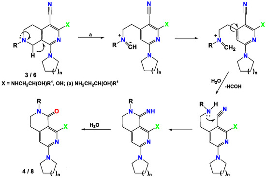 It should be noted that in the case of 1-amino-3-oxo-2,7-naphthyridines 6a–f, the reaction is so fast that the influence of the alkyl (isopropyl or benzyl) and cyclic amine (pyrrolidinyl, piperidinyl, and azepane) groups in the rearrangement reaction is not observed. The rearrangement reaction in the 1-amino-3-oxo-2,7-naphthyridine series is greatly facilitated and occurs significantly faster than in the case of 1,3-diamino-2,7-naphthyridines 3.