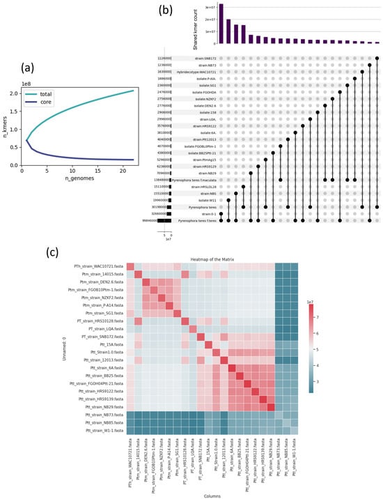 Integrated pangenomic analysis of Pyrenophora teres. (a) Collection curve depicting the accumulation of total and core k-mers as more genomes are sequenced, being the 22 genomes, suggesting a comprehensive pangenome that is not open, but rather is interconnected among different forms. (b) UpSet plot illustrating the intersections of k-mers for three representative groups of P. teres—‘Ptt strain W1-1’, ‘Ptm strain SG1’, and ‘hybrid strain WAC10721’—showing shared and unique genomic elements. (c) A heatmap of the adjacency matrix displaying k-mer-based clustering of various P. teres strains, offering insights into the relationships both within and between P. teres forms.