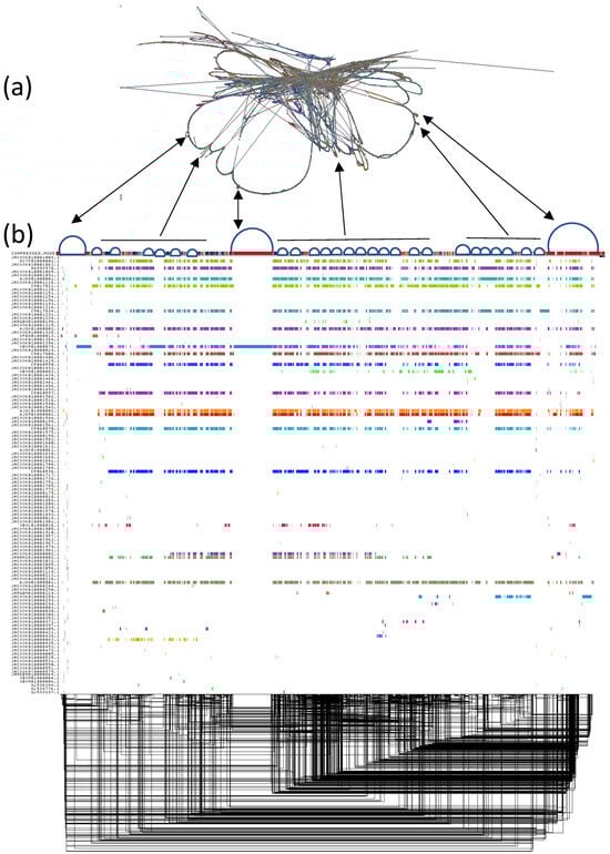 PanKmer’s pankmer collect was used to calculate and plot collection curves, assessing the pangenome completeness and core k-mers among the 22 genomes. An UpSet plot was generated to visualize k-mer intersections, and MATLAB v 3.8.0 was used for the visualization of the adjacency matrix [65]. The ggmsa package in R was used to visualize the consensus sequence and its alignment across the genome collection using the ClustalW algorithm implemented in the MSA (Multiple Sequence Alignment) package [66,67].