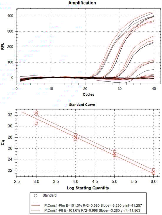 To determine the limit of detection (LoD), the probe was tested on a 10-fold serial dilution of pure P. teres f. teres Ptt (Ptt) or P. teres f. maculata (Ptm) gDNA (50 ng to 0.05 pg). The standard curve for P. teres was generated by plotting the log of DNA (ng) against the Cq value determined using qPCR. The recovered curves showed excellent linearity of amplification for both Ptt and Ptm (Figure 4). The qPCR efficiency values retrieved from these standard curves were 101.6 for Ptt and 101.3% for Ptm, meeting the requirement set in the MIQE guidelines [47]. Notably, we observed a sensitivity of 0.05 ng for both Ptt and Ptm, which is comparable to the sensitivity observed for other fungal phytopathogens [48].