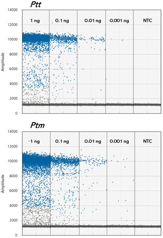 Limit of detection using the templates of Ptt or Ptm genomic DNA.