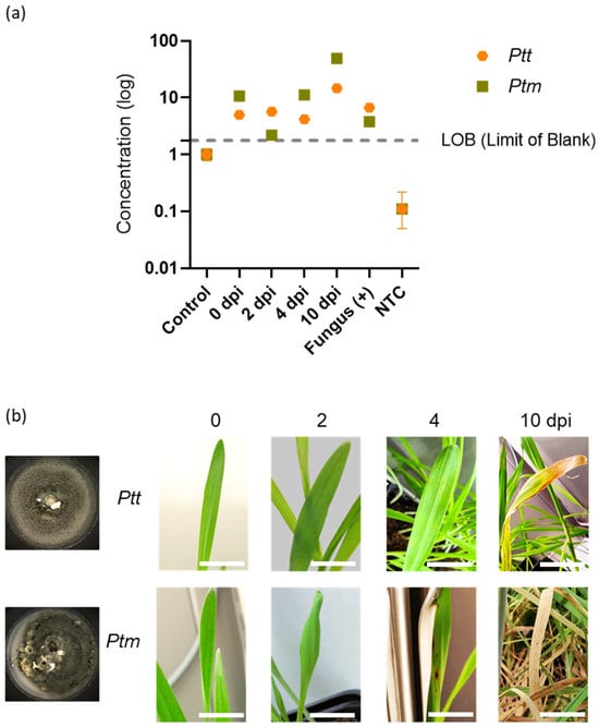 As expected and shown in Figure 6a (and Supplementary Figure S8), negative controls, including non-infected barley leaves (Control) and NTC, were below the LoB. Positive controls for Ptt and Ptm were detected, respectively, at 6.87 and 3.89 copies/reaction, respectively. For in planta detection, both Ptt and Ptm were detected as early as 0 dpi and reached an optimum at 10 dpi with respective values of 11.9 and 50.8 copies/reaction.