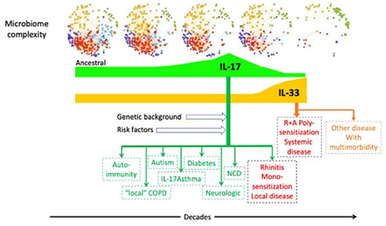 Recent findings have led to the formulation of the ARIA-MeDALL hypothesis that rhinitis alone may be a distinct entity from rhinitis and asthma multimorbidity (A + R) with clinical and therapeutic relevance. This hypothesis is supported by several factors: (i) distinct gene expression profiles observed in rhinitis, which show a preference for toll-like receptor and IL-17 expression, as opposed to A + R, where IL-33 and IL-5 are more prominently expressed [10]; (ii) differing allergen sensitization patterns, with rhinitis typically involving mono- or pauci-sensitization, while A + R tends to show polysensitization [11,12]; (iii) the greater symptom severity observed in epidemiological studies [13,14]; (iv) real-life studies; and (v) differences in treatment response. The hypothesis focuses on the roles of IL-17 and IL-33 and their interactions with the microbiome, along with various co-factors. Depending on genetic factors (such as toll-like receptors (TLR) and IL-33 variants), environmental influences, and other defined or unknown elements, the interaction between these cytokines and the microbiome varies. In the context of a healthy ancestral microbiome, IL-17 performs its typical protective role. However, as the microbiome’s diversity diminishes, IL-17 can become pathogenic, engaging with TLRs to drive localized disease. In cases of rhinitis, there is IgE production in response to a limited range of allergens. With further loss of microbiome complexity, the IL-33 pathway becomes activated, leading to multimorbidity (asthma and rhinitis) and polysensitization in individuals who are genetically predisposed (Table 1, Figure 1).