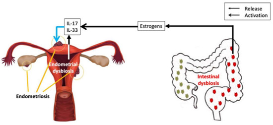 Infertility, defined as the inability to obtain pregnancy after 12 months of regular unprotected sexual intercourse, has increased in prevalence over the past decades, similarly to chronic, allergic, autoimmune, or neurodegenerative diseases. A recent ARIA-MeDALL hypothesis has proposed that all these diseases are linked to dysbiosis and to some cytokines such as interleukin 17 (IL-17) and interleukin 33 (IL-33). Our paper suggests that endometriosis, a leading cause of infertility, is linked to endometrial dysbiosis and two key cytokines, IL-17 and IL-33, which interact with intestinal dysbiosis. Intestinal dysbiosis contributes to elevated estrogen levels, a primary factor in endometriosis. Estrogens strongly activate IL-17 and IL-33, supporting the existence of a gut–endometrial axis as a significant contributor to infertility.
