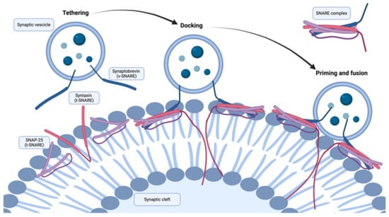Steps in synaptic vesicle fusion and critical proteins involved (realized with BioRender.com, accessed on 10 April 2024). The exocytosis of synaptic vesicles includes different stages, such as tethering, docking, priming, and fusion. In the docking step, SNARE proteins interact with each other via SNARE motifs. The matching progresses from the N-terminus of the SNARE proteins to the C-terminal transmembrane regions, where the membranes interact. The resulting trans-SNARE complex firmly pulls the two membranes together (that of the synaptic vesicle and that of the plasma membrane of the nervous cell), providing the energy to fuse the lipid bilayers.