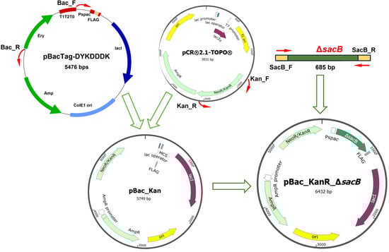 The purposeful inactivation of the sacB gene, encoding levan-producing levansucrase in BL24, was performed by insertional inactivation of a shuttle vector. Homologous recombination of a disrupted sacB and the reporter gene with the chromosome of BL24 was achieved in several cloning steps. The backbone of the construct was the integrative vector pBacTag-DYKDDDK (Figure 1). However, the selectable marker of the vector for erythromycin (EryR) appeared unsuitable because BL24 is resistant to erythromycin up to a concentration of 300 μg/mL. Since the host strain is susceptible to kanamycin at every concentration, aminoglycoside phosphotransferase from transposon Tn5, which confers resistance to kanamycin and neomycin (KanR/NeoR), was chosen as an appropriate reporter gene. Using the primer pairs Bac_F and Bac_R, the vector backbone was amplified with the excision of EryR and the T1T2T0 terminator sequence. The obtained partial version of pBacTag-DYKDDDK (4740 bp) was ligated by Gibson Assembly® to the fragment (1009 bp) which contained KanR with its promoter and which was previously PCR-amplified from the pCR®2.1-TOPO vector as a template. The resulting shuttle vector, pBac_KanR (5749 bp), was linearized with KpnI, amplified, and assembled with the truncated and mutated ΔsacB (685 bp) obtained as a PCR product with template BL24 chromosomal DNA. The final construct, pBac_KanR_ΔsacB (6432 bp), was used to transform BL24.