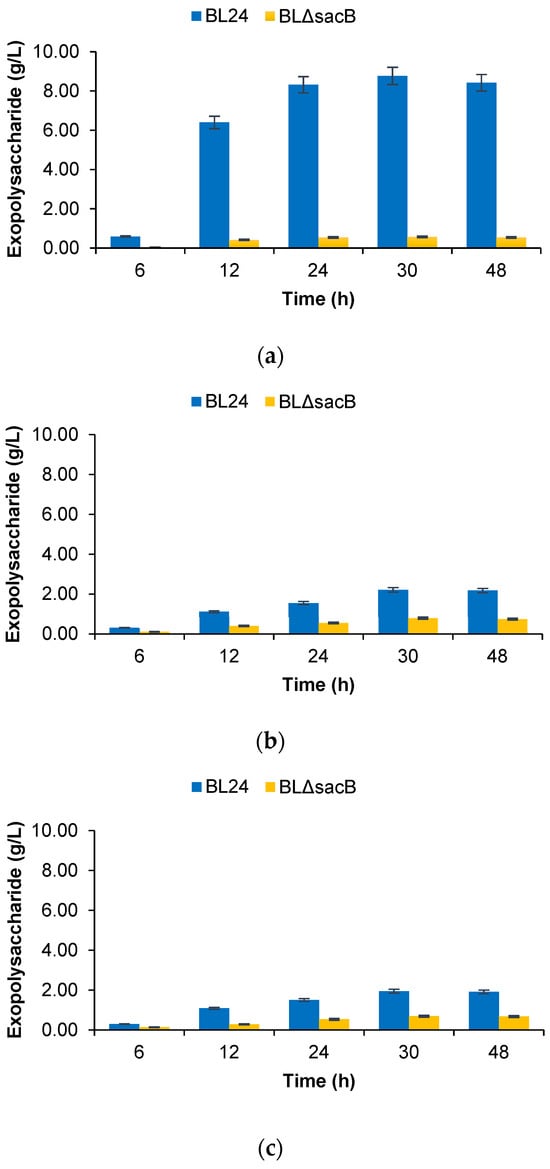 Time profiles of exopolysaccharides (EPS) formation by BL24 and its engineered variant, BLΔsacB, during the course of flask-batch fermentation processes with a 50 g/L concentration of different sugars on a rotary shaker at 37 °C and 200 rpm for 48 h. (a) Sucrose; (b) Glucose; (c) Fructose.