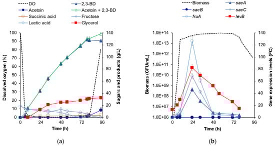 Production of 2,3-butanediol by BLΔsacB from 300 g/L soluble chicory flour Frutafit® CLR at pH 6.50. (a) Time profile of 2,3-BD and byproducts formation, fructose and dissolved oxygen (DO); (b) Gene overexpression presented as a fold-change compared to the rate observed at 0 h of the process carried out at pH 5.25 []. The fermentation was performed in a bioreactor at 37 °C, with agitation at 500 rpm and aeration at 3.68 vvm.
