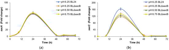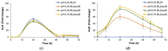 The lack of expression of sacB proves its successful disruption. Compared to the wild-type BL24, sacA, sacC, and fruA attained their upregulated expression at pH 6.25 vs. pH 5.25, conforming to the results shown previously by Tsigoriyna et al. []. However, the behavior of levB was completely different (Figure 4d). Its expression increased between 60- and 88-fold, depending on the pH of the processes with BLΔsacB, while it remained unaffected in the wild-type BL24. At the 48th h, all gene overexpression (except that of levB) entirely declined. The upregulation of levB remained high through to the end of the processes, with over 20-fold overexpression in BLΔsacB until the 72nd h.