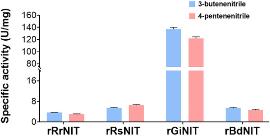 Specific activities of the recombinant nitrilases. The activity is determined with 3-butenenitrile and 4-pentenenitrile as substrates, respectively, at pH 7.5 and 45 °C.