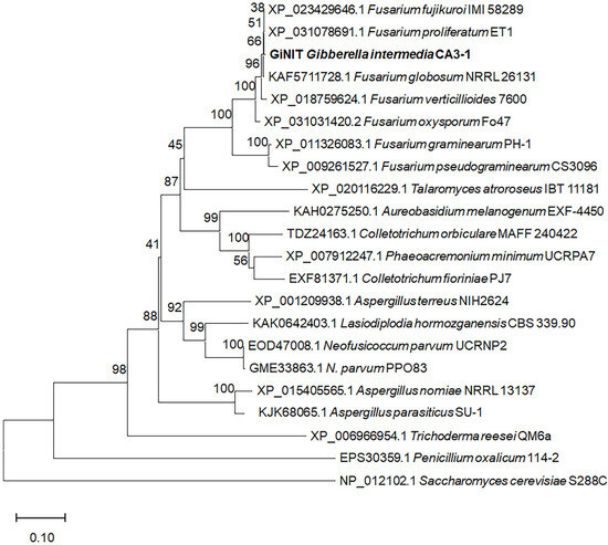 Evolutionary tree of GiNIT and its putative homologs. The cladogram is constructed according to the neighbor-joining method and Poisson model. Bootstrap values are obtained via calculation after setting 1000 replicates and are shown at the nodes.