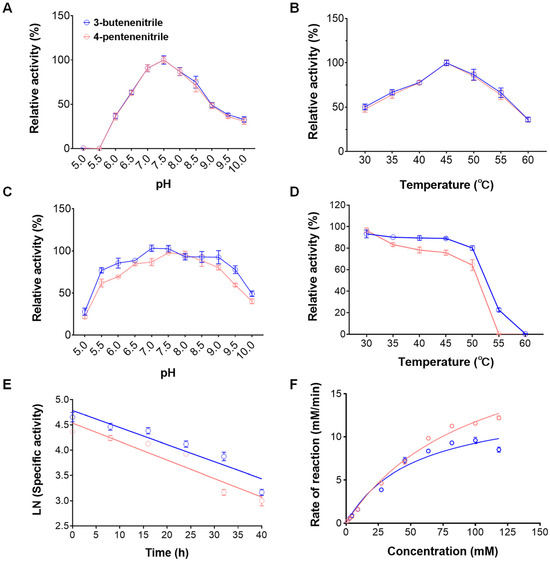 Enzymatic properties of rGiNIT with 3-butenenitrile and 4-pentenenitrile as substrates. (A) pH profile of nitrilase activity; (B) temperature profile of nitrilase activity; (C) effects of pH on nitrilase stability; (D) effects of temperature on nitrilase thermostability; (E) determination of the half-life of rGiNIT at the optimal pH and temperature; (F) determination of Michaelis–Menten constants of rGiNIT. In panels (A,B), the highest enzyme activity was set as 100%. In panels (C,D), the specific activity measured for the untreated nitrilase was set as 100%.