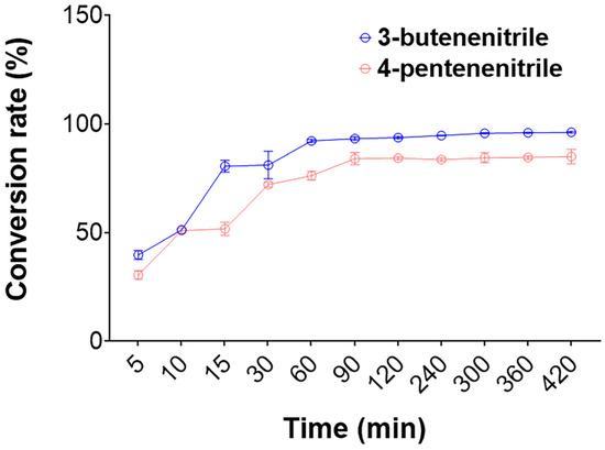 Hydrolysis of 3-butenenitrile and 4-pentenenitrile by the nitrilase rGiNIT. The reaction was performed at pH 7.5 and 45 °C.