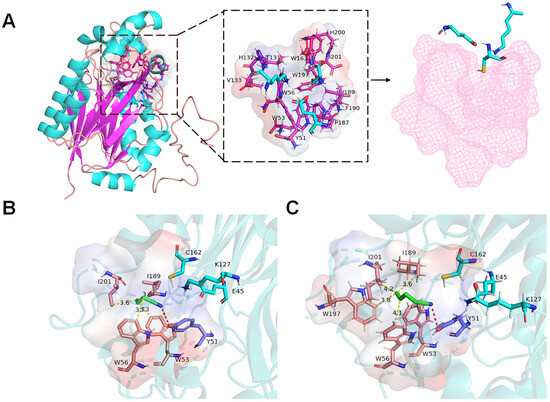 Structure analysis of nitrilase GiNIT (A) and molecular docking with 3-butenenitrile (B) and 4-pentenenitrile (C). In panel (A), the 3D structure model of nitrilase GiNIT is predicted with AlphaFold 2.0. Blue amino acid residues constitute the catalytic triad; red amino acid residues constitute the substrate binding pocket; the pink contour is the surface display of the substrate binding pocket. In panels (B,C), the blue color indicates the substrate molecule.