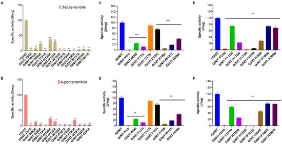 Specific activities of the nitrilase rGiNIT and its mutants. The activity was determined using 3-butenenitrile (A,C,E) and 4-pentenenitrile (B,D,F) as substrates, respectively, at pH 7.5 and 45 °C. ** p < 0.01 indicates significant differences between mutants and the wild-type enzyme.