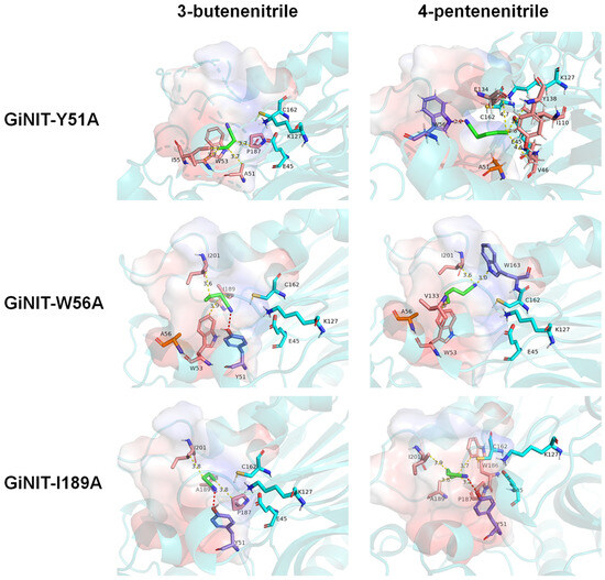 After the key amino acid Y51 was mutated to alanine, there was no hydrogen bond formed when the mutated enzyme GiNIT-Y51A docked with 3-butenenitrile, and the position of substrate binding deviated from the native substrate binding pocket to the catalytic triad. When GiNIT-Y51A docked with 4-pentenenitrile, the amino acid forming a hydrogen bond became W56, which is far away from the catalytic triad. The docking results of mutant nitrilases GiNIT-W53A, GiNIT-T131A, GiNIT-W163A, GiNIT-P187A, and GiNIT-F190A were similar to that of GiNIT-Y51A (Figure S2). When GiNIT-W56A docked with 3-butenenitrile, it formed hydrogen bonds with amino acid residue Y51, and the position of binding to the active pocket was close to K127. Differently, when GiNIT-W56A docked with 4-pentenenitrile, no hydrogen bond was formed (Figure 7). The molecular docking of the mutant nitrilases GiNIT-H132A and GiNIT-V133A with substrates displayed similar results to that of GiNIT-W56A (Figure S2). Therefore, it was speculated that the position of the substrate binding to the active pocket crucially affected the nitrilase activity.