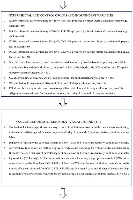 - Louwakul, P.; Saelo, A.; Khemaleelakul, S. Efficacy of calcium oxide and calcium hydroxide nanoparticles on the elimination of Enterococcus faecalis in human root dentin. Clin. Oral Investig. 2017, 21, 865–871. [Google Scholar] [CrossRef]