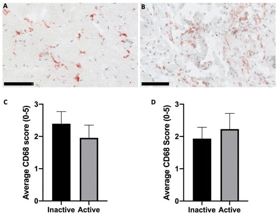 Representative images of CD68 staining within the ST sublining of an inactive RA and active RA patient’s sample are presented in Figure 2A,B. Samples used in the representative images were categorised into active (Figure 2A) versus inactive (Figure 2B) RA based on the DAS-28 criteria based on their DAS-28 score (Figure 2C). Samples were then categorised based on their CRP scores as a marker of inflammation (Figure 2D). There was no statistically significant difference between the CRP scores for the inactive RA patients when compared to the active RA cohort (Figure 2C,D).