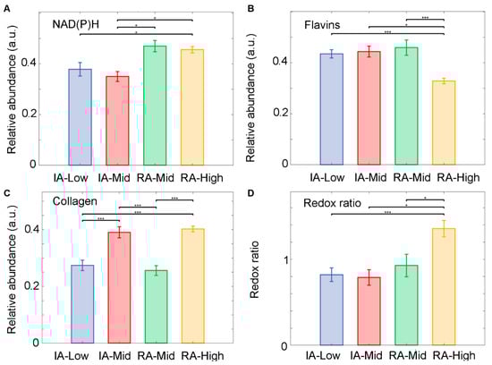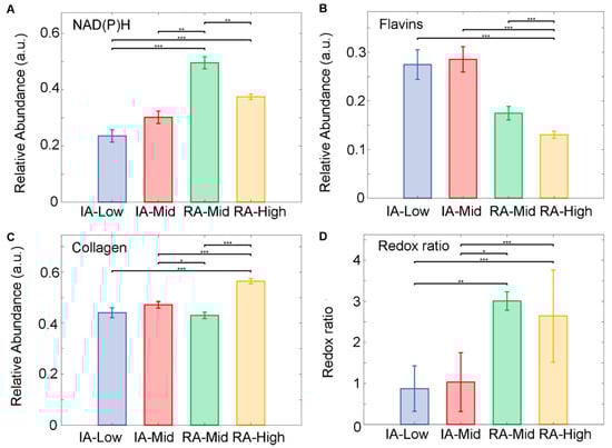 A similar analysis for the cells (fluorophore unmixing and feature analysis) was conducted for ST fibres. The unmixing of fluorophores detected an increased level of NAD(P)H within the active-RA disease state compared to inactive-RA (Figure 5A). A decreased level of flavins (Figure 5B) was observed in the RA-High group compared to RA-Mid; however, NAD(P)H in the RA-Mid and RA-High groups were higher than in the inactive group (IA-Low and IA-Mid). The IA-Mid group had a significantly greater abundance of NAD(P)H compared to all other groups (p < 0.001). Collagen abundance was (Figure 5C) significantly higher in the RA-High group compared to the IA-Low and RA-Mid groups (p < 0.001). A significant increase in the optical redox ratio was measured in the RA-High group compared to all other groups (p < 0.05 for IA-Mid and RA-Mid groups, p < 0.001 for IA-Low) (Figure 5D).