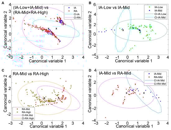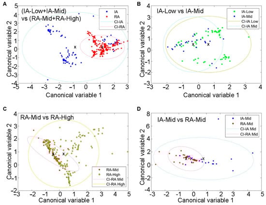 Differentiation of FT from inactive (IA) and active RA patients with varying disease and pain states by using both unmixing and auto fluorescent features. (A) Clusters of fibres from IA and active fibres, (B) clusters of IA (low and mid) fibres, (C) clusters of active (mid and high) fibres in the two groups, and (D) clustering of IA-Mid and RA-Mid fibres. Symbols represent individual fibres. Ellipses are one standard deviation around the mean, with the central point indicated by a cross.