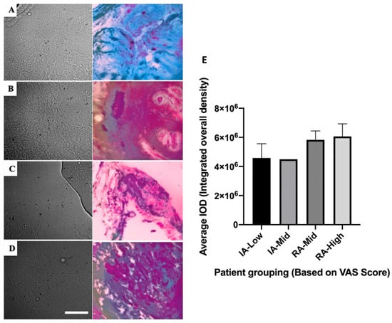 Bright-field images (first column) of synovial tissues with corresponding images highlighting disease state differences (by CYMK colour, second column). Rows are presented for four different groups: (A) Inactive (IA)-Low, (B) IA-Mid, (C) RA-Mid, and (D) RA-High. Scale bar is representative of 50 µm. Histological assessment of collagen type II abundance within ST was performed to validate the HAI process (E). Error bars represent SEM (IA-Low n = 8, IA-Mid n = 1, RA-Mid n = 4, RA-High n = 9).