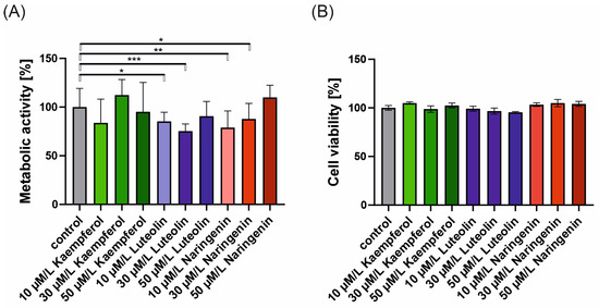 The effect of flavonoids on 16HBE14σ cells metabolic activity and cell viability. (A) changes in cell metabolic activity after 24 h incubation with flavonoids (kaempferol, luteolin, naringenin) at various concentrations (10, 30, and 50 μM). (B) Cell viability of cells incubated with flavonoids for 24 h was assessed by trypan blue staining. The results were normalized to control and presented as mean ± standard deviation (SD). Statistical analysis was evaluated by one-way ANOVA (* p < 0.05, ** p < 0.01, *** p < 0.001).