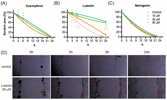 The effect of flavonoids on cell migration/proliferation was assessed by scratch assay. Figure 2 presents the scratch area changes in the presence and absence (control) of flavonoids. The effect of kaempferol and luteolin was observed, while no changes were detected for cells incubated with naringenin. A small, however statistically significant, concentration-dependent inhibitory effect was observed for kaempferol at all the concentrations used—Figure 2A. Luteolin had a strong and concentration-dependent inhibitory effect on cell proliferation—Figure 2B. At the highest concentration used (50 μM), cell proliferation was nearly entirely suppressed. On the other hand, naringenin did not affect the kinetics of scratch closure—Figure 2C. The rate of scratch closure at different time intervals was presented for control and luteolin in Figure 2D.