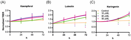 Impact of flavonoids on transepithelial electrical resistance in 16HBE14σ cell monolayers. Tight and polarized cell monolayers were treated apically with kaempferol (A), luteolin (B), and naringenin (C) at concentrations of 10, 30, and 50 μM. TEER was measured after 24, 48, and 72 h of incubation. Results were normalized to the TEER value measured before treatment (time 0 h). Graphs display mean values ± standard deviations (SD). Statistical significance compared to control was determined using a one-way ANOVA (* p < 0.05).