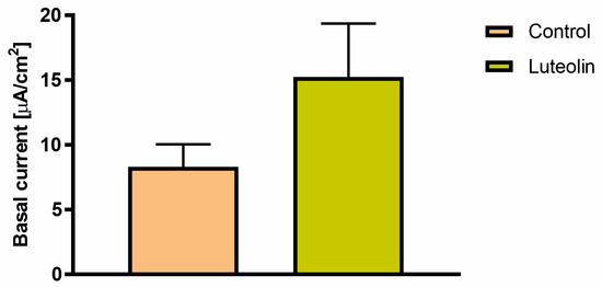 Changes in basal chloride current flowing through 16HBE14σ cell monolayers treated with 50 μM luteolin for 72 h. Chloride current was measured in the Ussing chamber in basolateral to apical chloride gradient. The data are presented as mean ± standard deviations (SD).