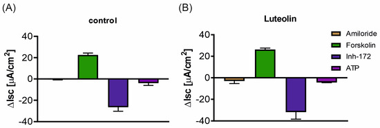Luteolin increased the basal current passing through cell monolayers (Figure 4). To further analyze the effect of luteolin treatment on the cystic fibrosis transmembrane conductance regulator (CFTR) channel activity, the cAMP-dependent Cl− transport was assessed by the addition of forskolin (Figure 5A,B) and the subsequent addition of CFTRinh-172. In cell monolayers treated with luteolin, the effect of forskolin and CFTRinh-172 was also more substantial compared to the control (Figure 5A,B). Neither the calcium-dependent Cl− transport induced by ATP nor the Na+ transport assessed by the amiloride were modified by luteolin (Figure 5A,B).