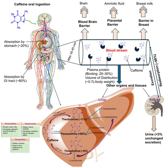Caffeine belongs to the Biopharmaceutical Classification System (BCS) Class I drugs because it is highly water-soluble and permeable. The liver metabolizes the most active components or drug(s) before they are entered into the bloodstream. But caffeine is rapidly absorbed. Hence, caffeine has minimal hepatic first-pass effects (the consequence of a drug’s rapid transformation when taken orally and resulting in reduced bioavailability) [21,22] (Figure 2). Also, caffeine is absorbed regardless of age, sex, and health, as well as the use of drug(s), alcohol, or nicotine because of minimal first-pass metabolism [23,24]. Moreover, caffeine exhibits a linear pharmacokinetic property, because a rise in caffeine dose causes a corresponding rise in blood plasma levels [25].