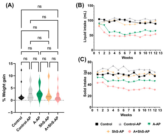 Clinical observations during the experimental period. (A) Representative percentage of weight gain in rats throughout the study (p > 0.05, one-way repeated-measures ANOVA followed by Tukey’s post hoc test). (B) Liquid and (C) solid intake by rats over time. Intake data are presented as the mean weekly consumption values for the following groups: control (■), control-AP (▲), A-AP (▼), ShS-AP (♦), and A+ShS-AP (●).