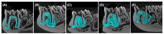 Axial micro-CT reconstructions showing (A) no AP development in the control group and confirmed AP development in the (B) A-AP, (C) ShS-AP, (D) A-AP and (E) A+ShS-AP groups. Yellow arrows indicate the coronal opening used to induce apical lesions. Blue hatched areas represent the extent of the apical lesion (B–D) compared to the absence of lesions and normal periodontal ligaments in the control group (A).