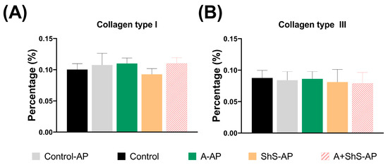 No significant fibrosis was induced by AP or deleterious habits. There were no significant differences in collagen type I and III deposition among all groups (p > 0.05) (Figure 3A,B).