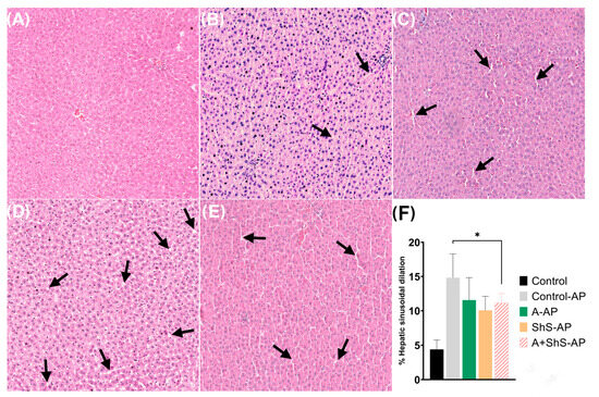 Photomicrographs of liver sections evaluating hepatic sinusoidal dilation from the (A) control, (B) control-AP, (C) A-AP, (D) ShS-AP, and (E) A+ShS-AP groups (20× magnification). The hepatic sinusoidal dilation values are expressed in percentages (F). Note the sinusoidal dilation by black arrows. * p < 0.05 vs. control group.