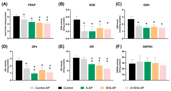 Assessment of (A) overall antioxidant capacity, (B) superoxide dismutase, (C) reduced glutathione, (D) glutathione peroxidase, (E) glutathione reductase, and (F) glucose 6-phosphate dehydrogenase. The values are presented as mean ± standard deviation. * p < 0.05 vs. control group, # p < 0.05 vs. control-AP.