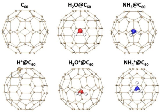 The proton, as an elementary particle, differs from all other ions that are stable in aqueous solutions. When introduced into water, a proton does not exist independently but rapidly combines with neighboring water molecules to form a hydronium cation (H3O+) []. Protons show the same behavior in ammonia, forming ammonium ion (NH4+) []. Moreover, the hydration of H3O+ and NH4+ plays an important role in the physical and natural sciences [,]. This is due to hydrogen bonding network formed in aqueous acid–base chemistry. Meanwhile, H3O+ batteries are considered one of the most promising energy technologies as a next-generation power source, thanks to their cost-effectiveness and sustainability []. NH4+ and other species react to form the ammonium salt complex species in the natural environment []. However, little is known about encapsulation of H3O+ and NH4+ inside C60. Trapping H3O+ and NH4+ in a confined environment provides a unique opportunity to understand their novel properties. Hence, an in-depth study of the geometric and electronic structures of the cationic X+@C60 (X+ = H+, H3O+, and NH4+), as well as their corresponding neutral species (X = H2O, NH3), would certainly be a worthwhile exercise.