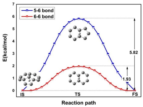 Energy profile for H diffusion from the atom to the 5-6 bond and 6-6 bond. The atomic geometries of the initial (IS), transition (TS), and final (FS) states are also given. The blue boxes and red circles indicate the 5-6 bond and 6-6 bond of the intrinsic reaction coordinate (IRC), respectively. The diffusion barrier is denoted by an arrow.