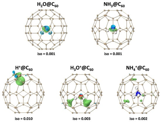 Electron density difference maps of X/X+@C60 (X+ = H+, H3O+, NH4+, X = H2O, NH3) and C60 cage at the B3LYP-D3(BJ)/6-31G(d, p) level of theory. The green and blue indicate the accumulation and the depletion of the electron density, respectively.