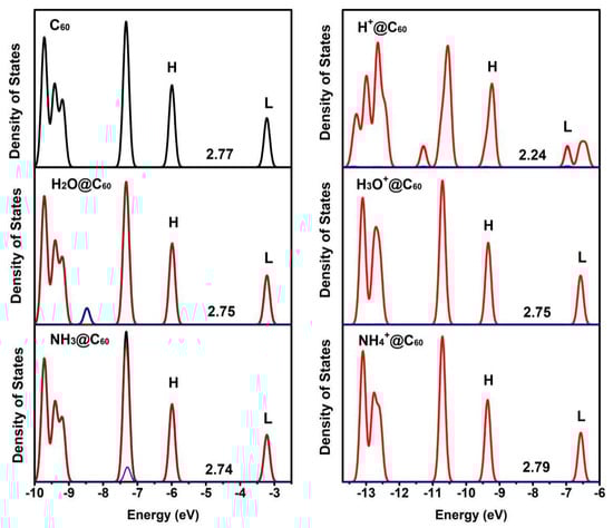 Total density of states (TDOS) and the partial density of states (PDOS) for C60, X+@C60 (X+ = H+, H3O+, NH4+), and X@C60 (X = H2O, NH3) at the B3LYP-D3(BJ)/6-31G(d, p) level of theory. Black represents the TDOS of X/X+@C60. Red and blue lines represent the contribution of two fragments of the C60 cage and X/X+ to the DOS, respectively. H and L represent the highest occupied molecular orbital (HOMO) and lowest unoccupied molecular orbital (LUMO), respectively. The energy gap is marked in the figure (unit is kcal/mol).