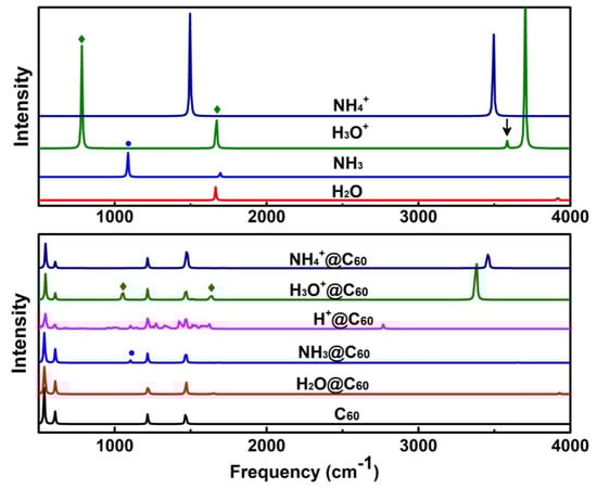 IR spectra for X = H2O, NH3, X+ = H+, H3O+, NH4+, and X/X+@C60 at the B3LYP-D3(BJ)/6-31G(d, p) level of theory.