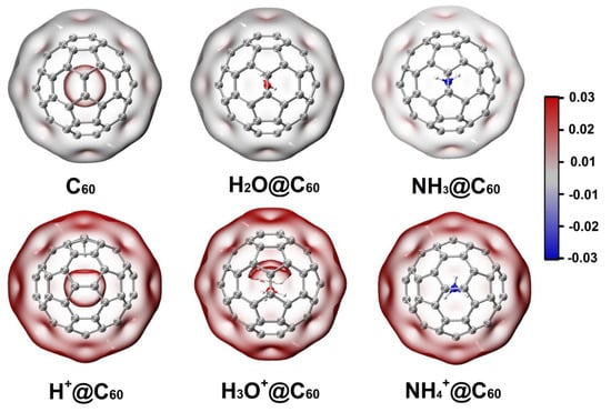 In order to quantitatively estimate the interaction between X/X+ and C60, we performed atomic dipole moment corrected Hirshfeld charge fitting (ADCH), as shown in Table 3. Generally, the ADCH charge is a good charge population analysis method for confined systems []. The ADCH charge on X/X+@C60 is higher than that on free X/X+ because the electronegativity of C is greater than that of X/X+. Here, it can be seen that the H2O (O: −0.714 e) and NH3 (N: −0.968 e) possess larger negative charges than H2O@C60 (O: −0.538 e) and NH3@C60 (N: −0.538 e), and H2O (H: 0.357 e) and NH3 (H: 0.323 e) possess larger positive charges than H2O@C60 (H: 0.266 e) and NH3@C60 (H: 0.233 e), indicating the interaction between H2O, NH3 and C60. However, the ADCH charges of H+@C60 (H: 0.053 e) are noticeably smaller than that of free H+(H: 1 e), indicating stronger interaction between H+ and C60. The H3O+ (O: −0.480 e) has a relatively larger negative charge than H3O+@C60 (O: −0.165 e). The charges are less accumulated in the H3O+@ C60, which implies a charge transfer effect from H3O+ to the C60 cage. In addition, the ADCH charges of H (0.493 e) are the same in the H3O+, while the ADCH charges of H are not equal in H3O+@C60. This may be because the H3O+ encapsulated inside the fullerene cage shows a slight deviation from the center. The ADCH charges of NH4+ (N: −0.249 e) possess a larger negative charge than NH4+@C60 (N: −0.134 e). However, The ADCH charges of NH4+ (H: 0.312 e) are the same, and the charges of H are also not equal in NH4+@C60.