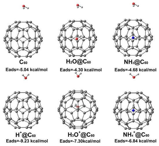 Optimized water adsorption structures on C60, X+@C60 (X+ = H+, H3O+, NH4+), and X@C60 (X = H2O, NH3). In these structures, red, white, cyan, and blue denote O, H, C, and N atoms, respectively.