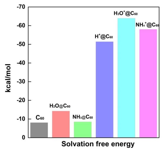 To explicitly assess the effect of solvent on X/X+@C60 interactions, the IEFPCM (integral equation formalism–PCM model) was calculated (see Figure 9). All the negative solvation energies indicate spontaneous solvation. It can be inferred from the above data that a smaller value of solvation energy leads to improved solubility of the complex in the aqueous phase. Solvation studies also reveal that the solvent medium, i.e., water, stabilizes the complex by decreasing its solvation energy. The solvation energies for C60, H2O@C60 and NH3@C60 are −8.08 kcal/mol, −14.26 kcal/mol, and −8.51 kcal/mol, respectively. It is observed that the solvation energy of C60 is slightly higher than the calculated solvation energy of NH3@C60. Among the neutral species, the solvation energy of H2O@C60 is the lowest, indicating that H2O@C60 is stable in the aqueous phase. However, the solvation energies for H+@C60, H3O+@C60 and NH4+@C60 are −51.42 kcal/mol, −63.94 kcal/mol, and −58.02 kcal/mol, respectively. H3O+@C60 has the lowest solvation energy, followed by NH4+@C60. H+@C60 has a relatively lower solvation energy, suggesting that H+@C60 is stable in the aqueous phase. This is consistent with the results from the adsorption energy analysis.