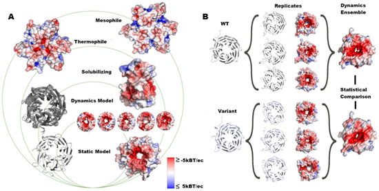 We used EDTsurf [42] to generate protein molecular surfaces using the Vertex-Connected Marching Cubes (VCMC) algorithm and the Molecular Surface (MS) parameter. We calculated the electrostatic potential for the structures using APBS [43] and PDB2PQR [44,45]. The electrostatic distribution data were mapped to the molecular surface from EDTSurf to obtain the surface potential values. These values were used to compute and visualize the differences between the variants and the WT. We used the whole protein surface to compare thermophilic and mesophilic proteins. Structures with variants had their surface character focused on a region surrounding the variant of interest. The local surface selection was used to obtain the tessellations from EDTsurf using any amino acids within a minimum pairwise distance of 4 Å (Figure S1). We then calculated the electrostatic potential values at this subset of surface points. To assess protein dynamic ensembles, the same procedure was followed for each representative frame (also referred to as a conformer), with pairwise interactions calculated for each representative and the combined values from across time used to compare the WT to mutations.