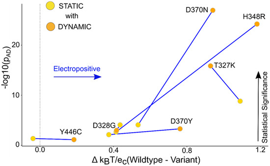 Scoring dynamic ensembles yielded more information with an average potential shift of 1.15 kBT/ec and an average pAD of 1 × 10−5; as for the TBL1XR1 dynamics ensemble, the average local surface potential shift was 0.85 kBT/ec with an average pAD of 1 × 10−10. Also, when we look at the statistical significance for TBL1XR1 and KCNK9, we see that 50% of the variants show significant p-values as a static structure. Still, we get about 86% of variants showing significant p-values using dynamics. This shows the dynamic ensemble data helps give a better idea about the local surface potential changes in cases where the static structures show a nuanced change.